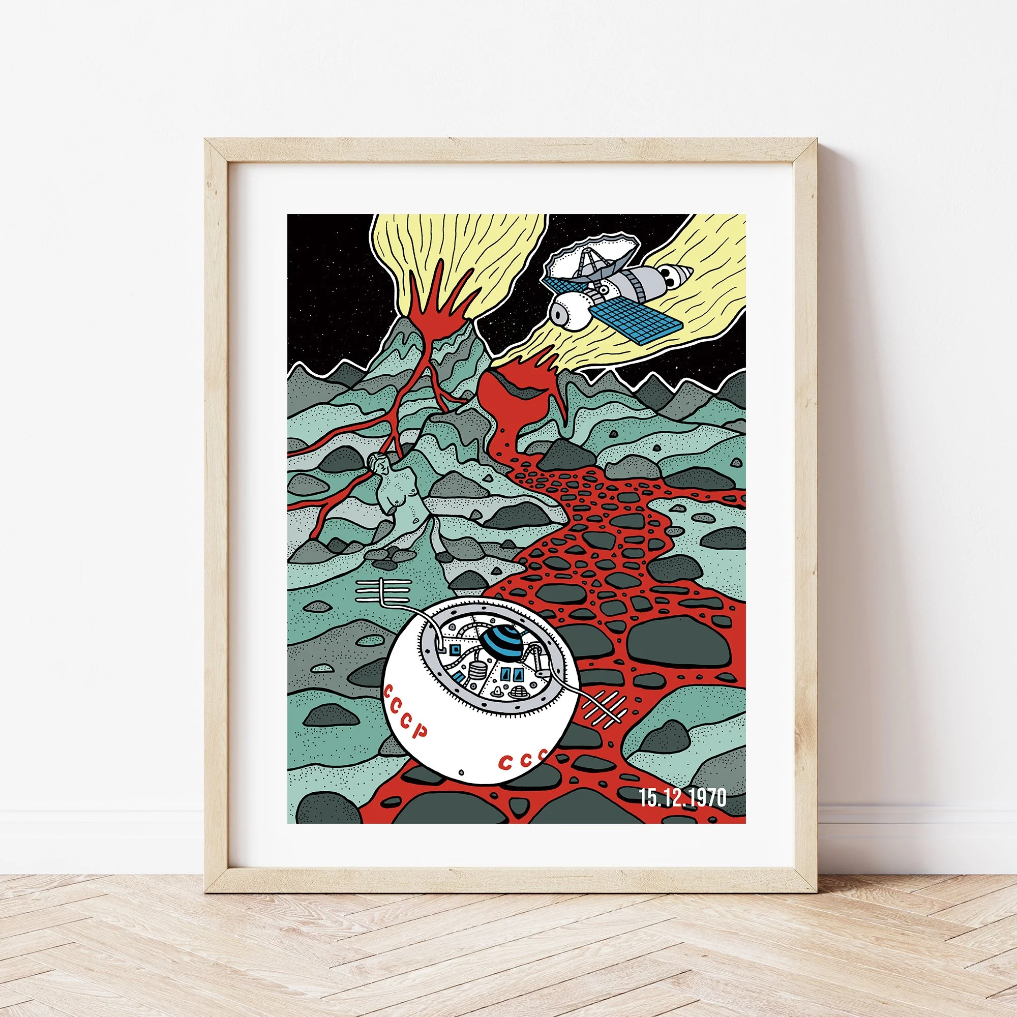 Venus, the second planet in our solar system. This print shows the landscape of Venus, which is the most volcanic known planet. It also shows the Venera 7, a Soviet spacecraft, which was the first probe mankind sent to the green planet on this day in 1970, and also became the first spacecraft to soft land on another planet and the first to transmit data from there back to Earth.